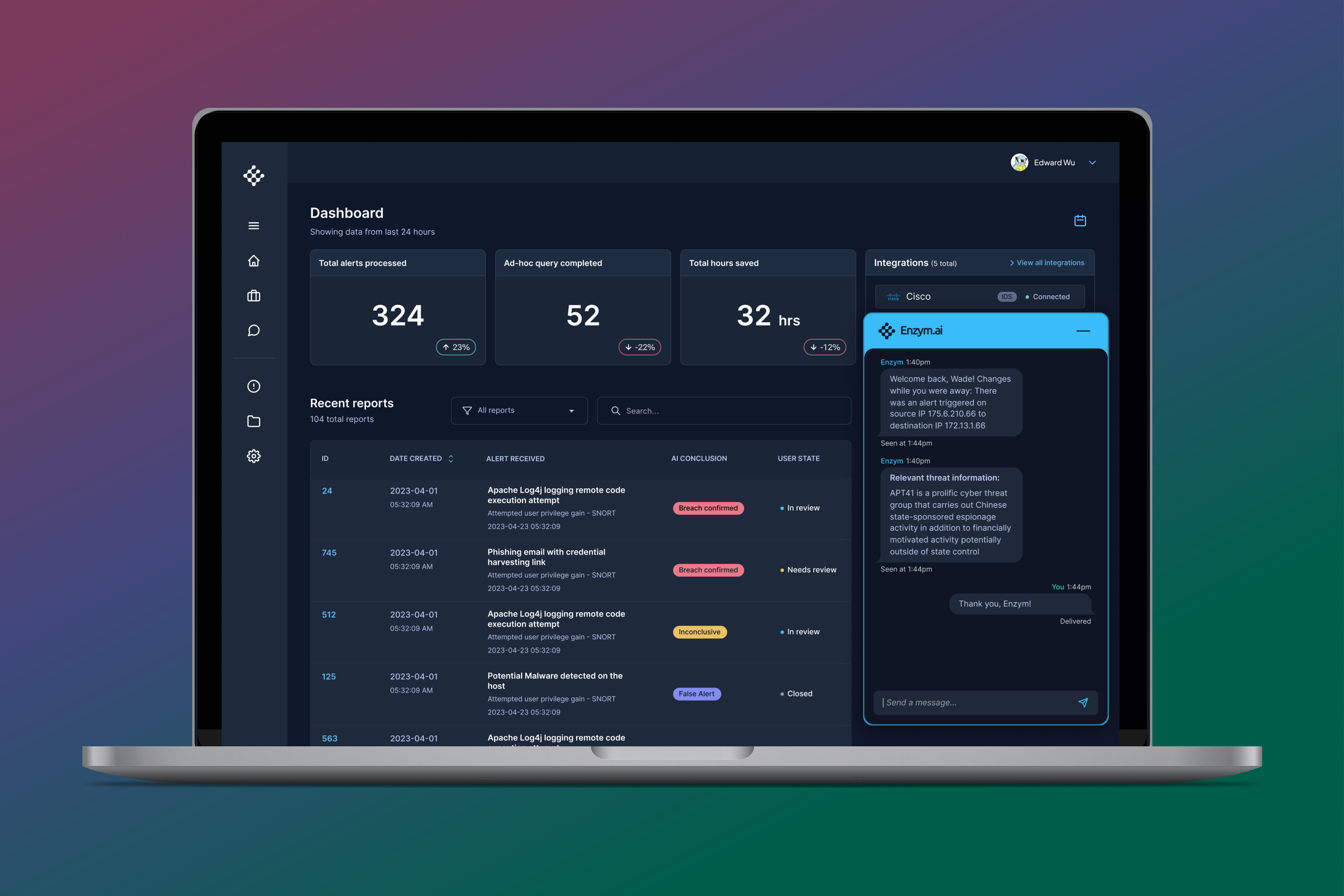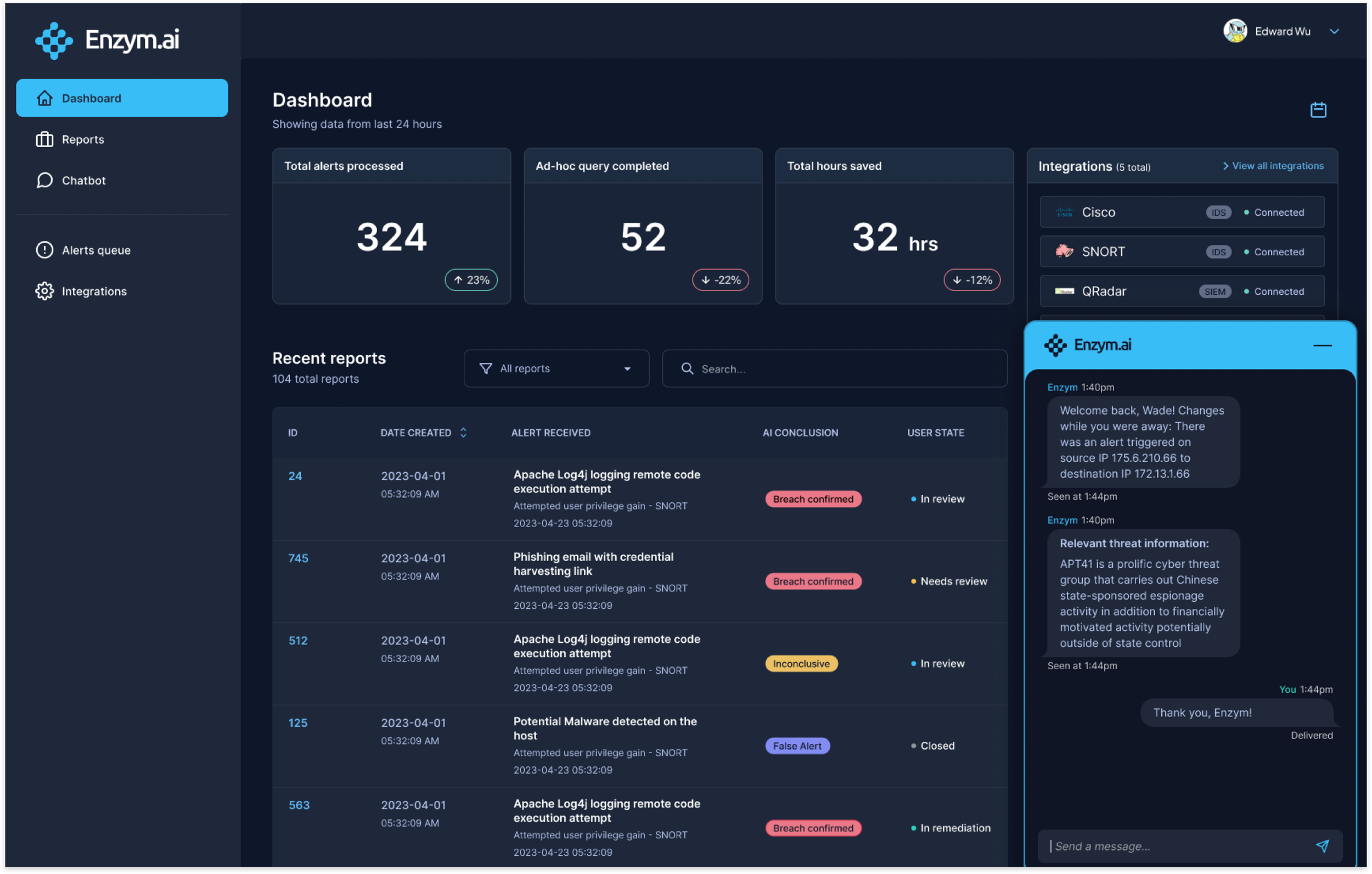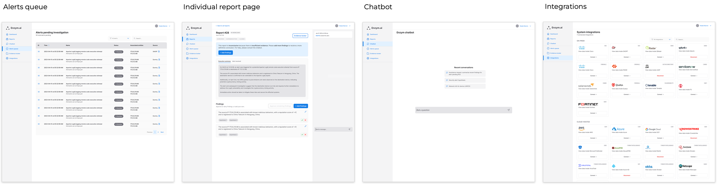 With a major cybersecurity conference approaching, Enzym AI needed to quickly deliver a polished, compelling product that could stand out in a crowded landscape of new AI solutions. They partnered with us to design and build the product UI, enabling attendees to interact with and experience the product in real time.