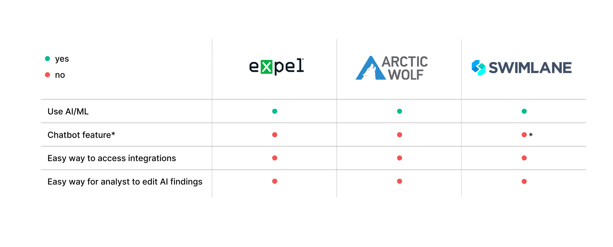 Through this research, I identified three key competitors offering similar security tooling: Expel, Swimlane Turbine, and Arctic Wolf.