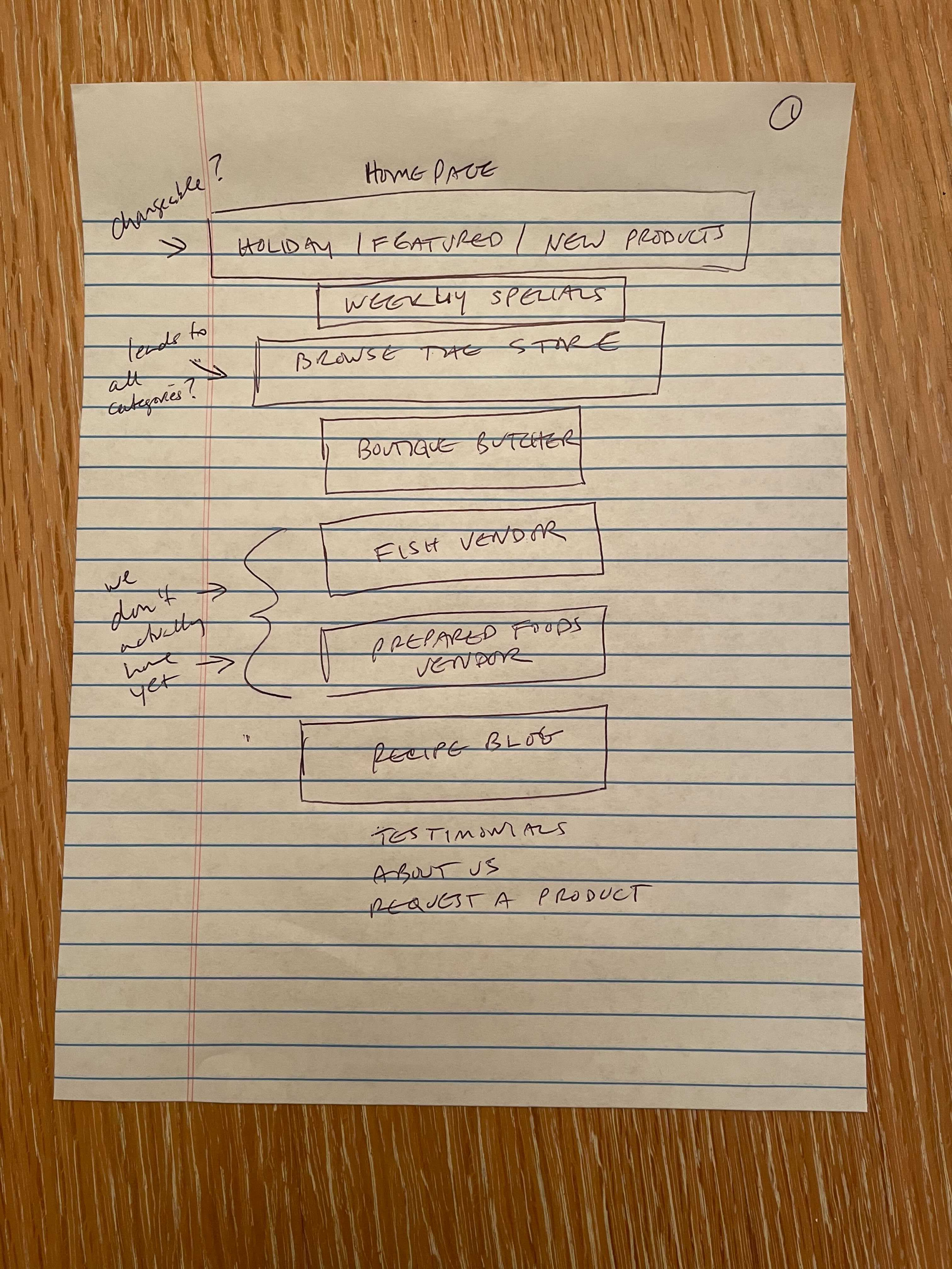 To show what information would be displayed on each new page, I created a sitemap which helped with organizing and sorting the new content. There would now be 3 new items on the homepage - Recipes, Cooking Directions, and Customer Testimonials. The “Weekly Specials” section would still be shown on the homepage, but its placement would now be moved to the top of the page.